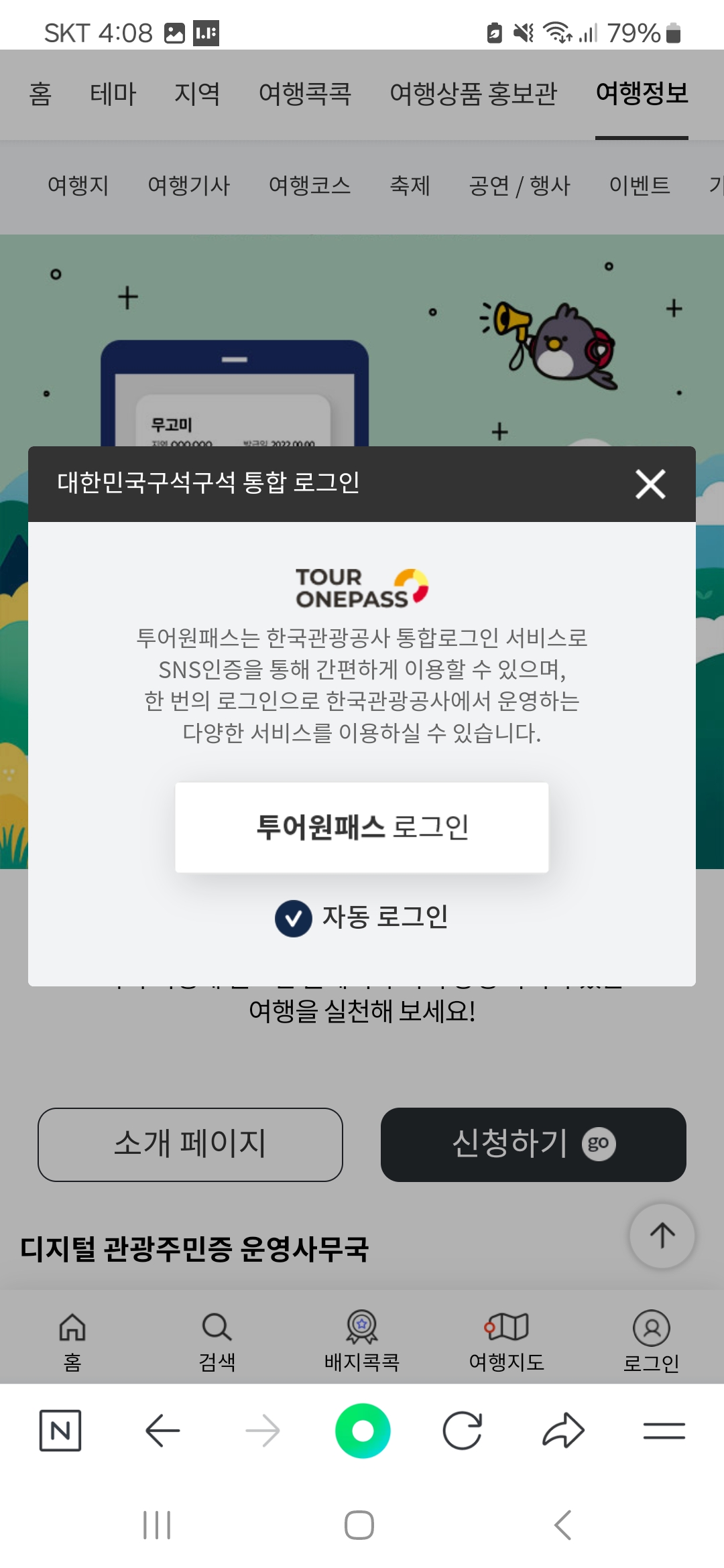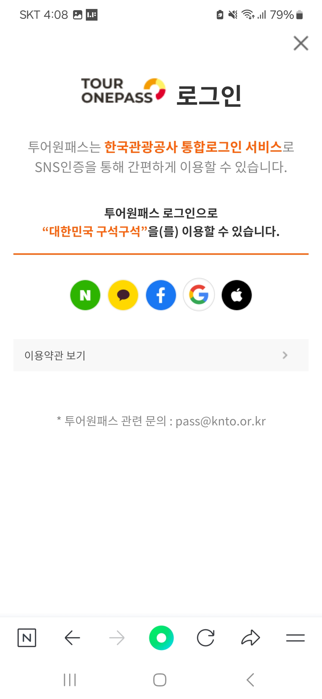 - SNS 인증을 통해 간편하게 로그인할 수 있습니다. / 투어원패스 로그인(한국관광공사 통합 로그인 서비스)