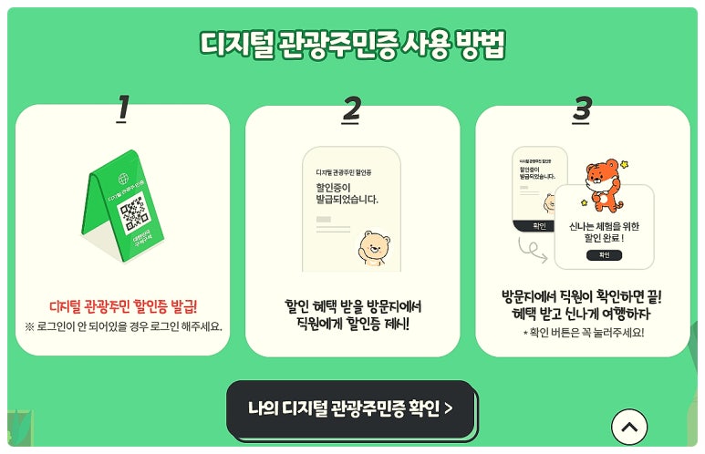 - 선택한 지역 관광지에서 관공주민증 확인 후 QR코드를 발급받아 할인 혜택을 받으시면 됩니다.