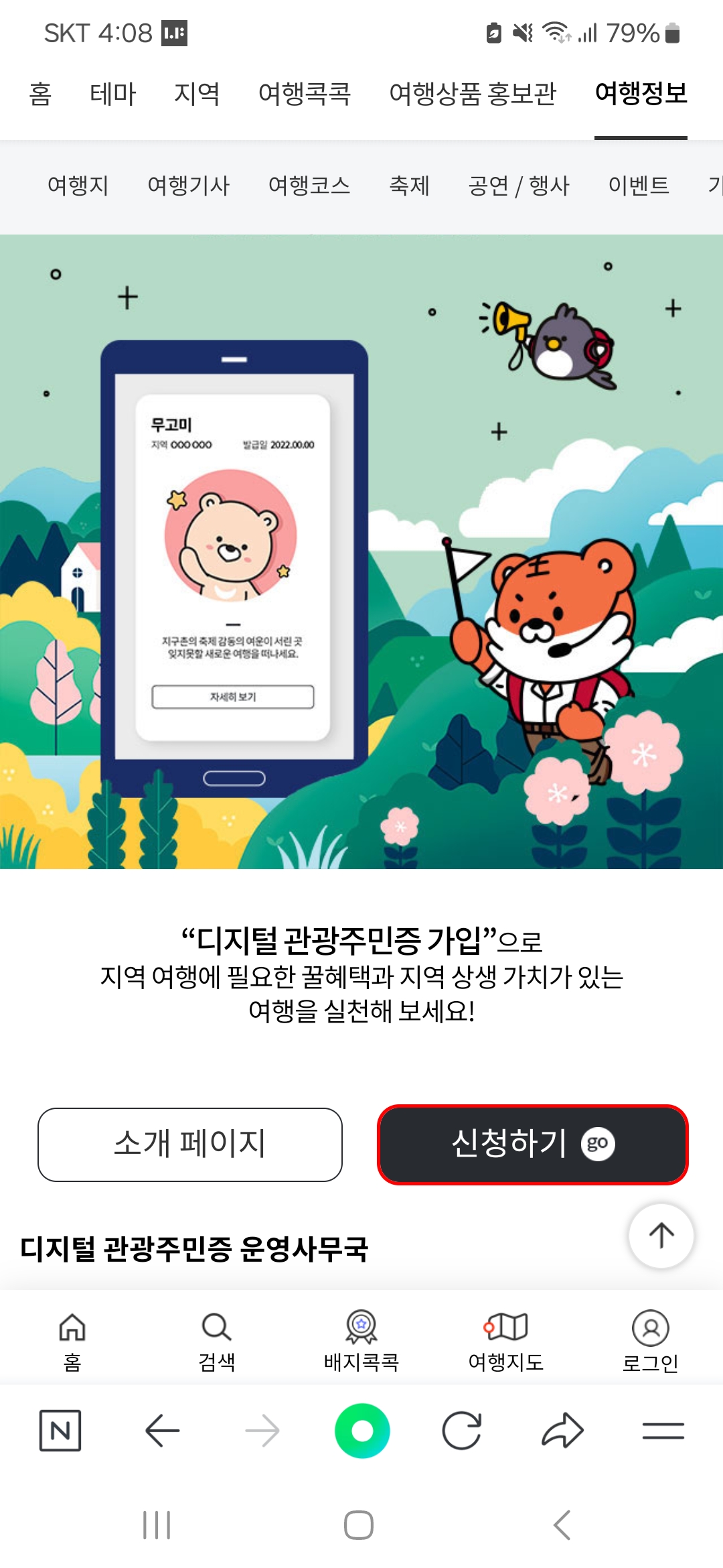 대한민국 구석구석 누리집에 접속 => 회원가입 => 로그인 => 디지털 관광 주민증 신청하기