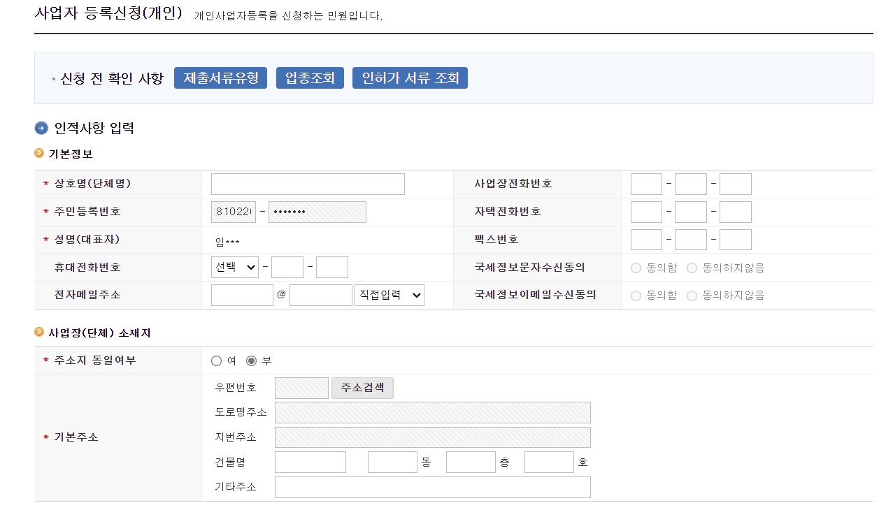 미리 상호명을 생각해 두시면 좋습니다. 저도 신청하면서 바로 생각해서 등록해서 지금 별로 상호명이 맘에 안 드네요. 괜찮은 상호명을 검색해 보고 고민하면서 정해두시길 권해드립니다.  상호명, 주민등록번호, 전화번호 등 기타 정보를 입력해 주세요.