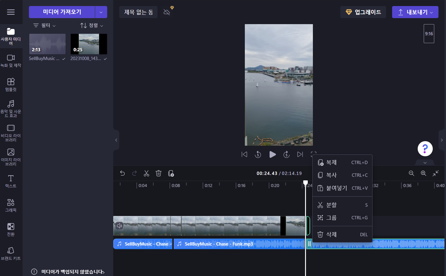 사용자 미디어를 클릭해서 준비한 영상과 음원을 가져옵니다. 영상의 사이즈는 9:16으로 맞춰줍니다.