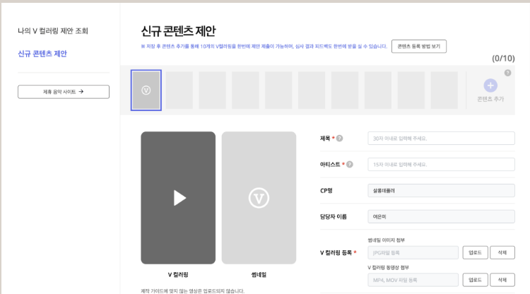 V컬러링 마켓플레이스에 로그인합니다. 그리고 신규콘텐츠 제안을 눌러 제목과 아티스트등 차근차근 입력합니다.